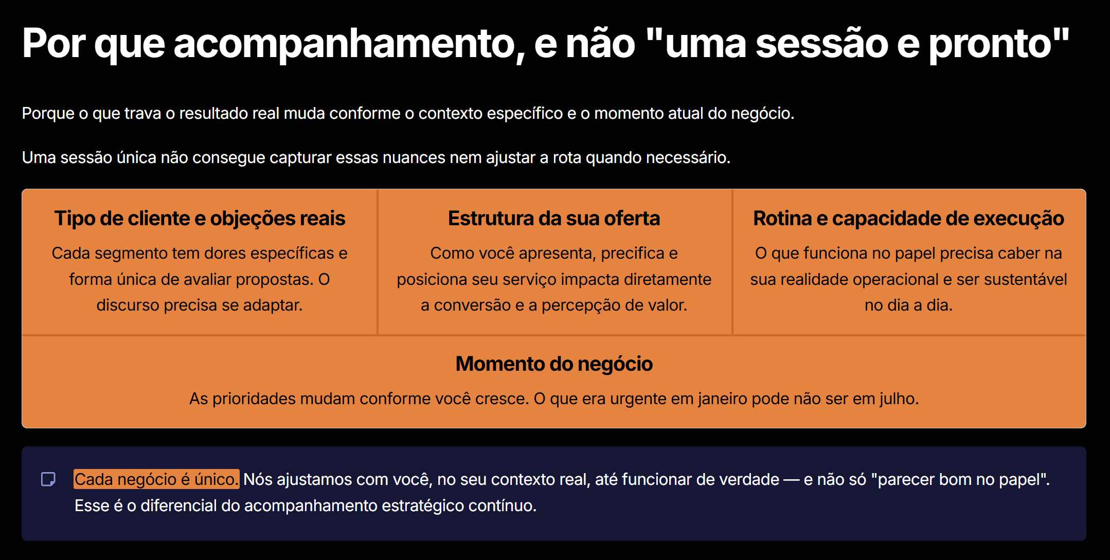 Nós não trabalhamos com “sessão única e boa sorte pra você”. Trabalhamos com acompanhamento estratégico que gera resultado real e sustentável. O processo é personalizado, objetivo e totalmente focado no seu contexto específico.